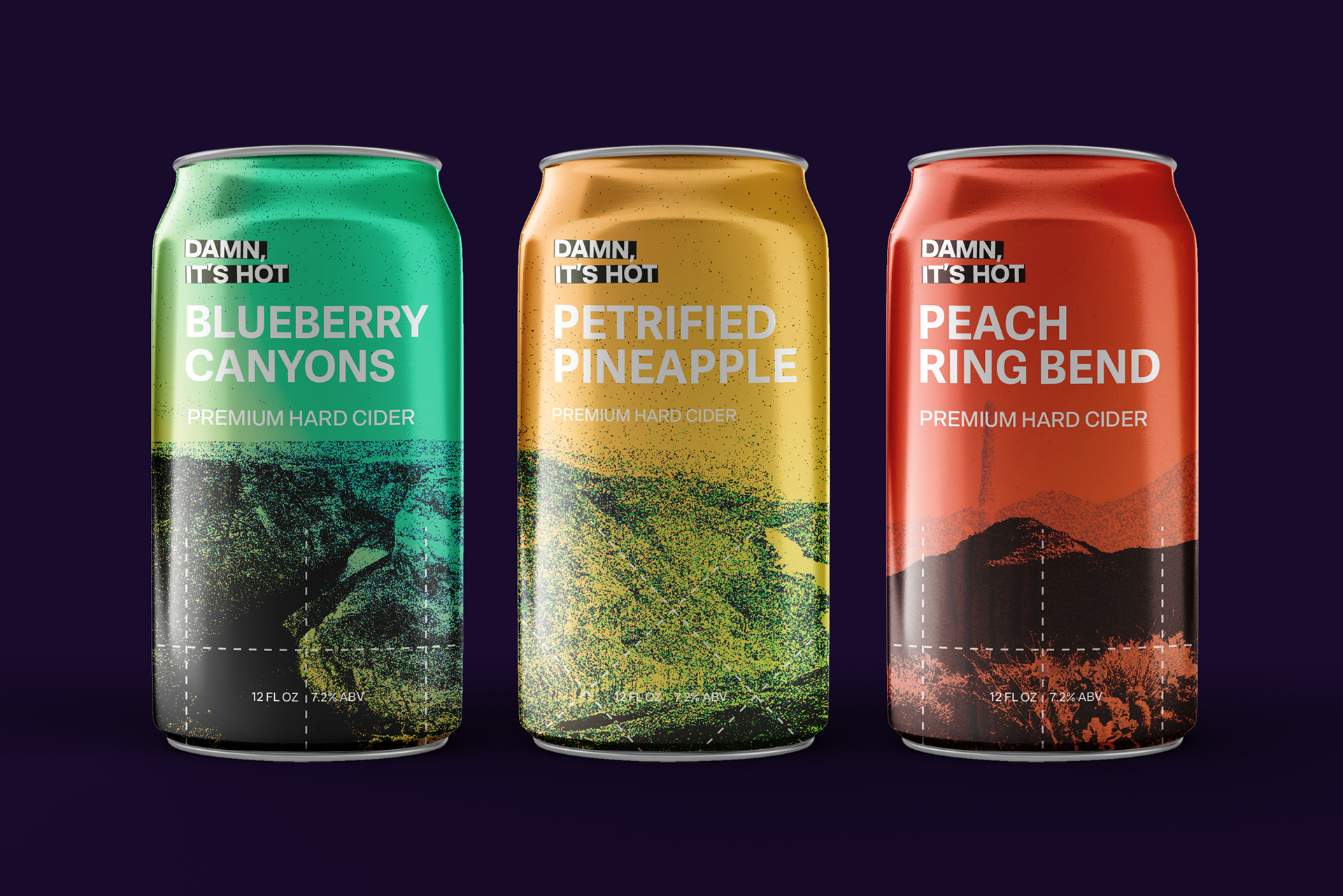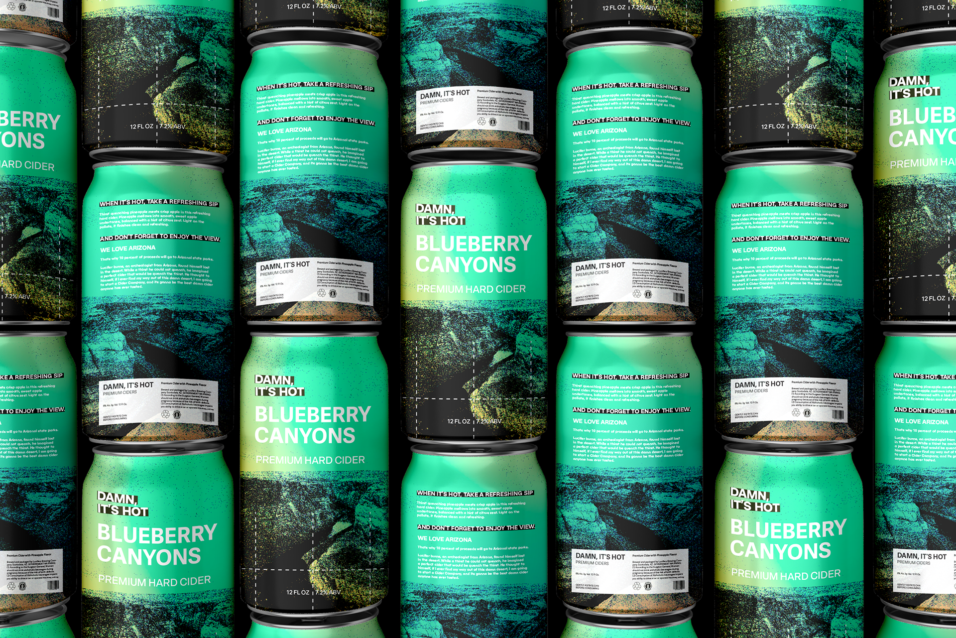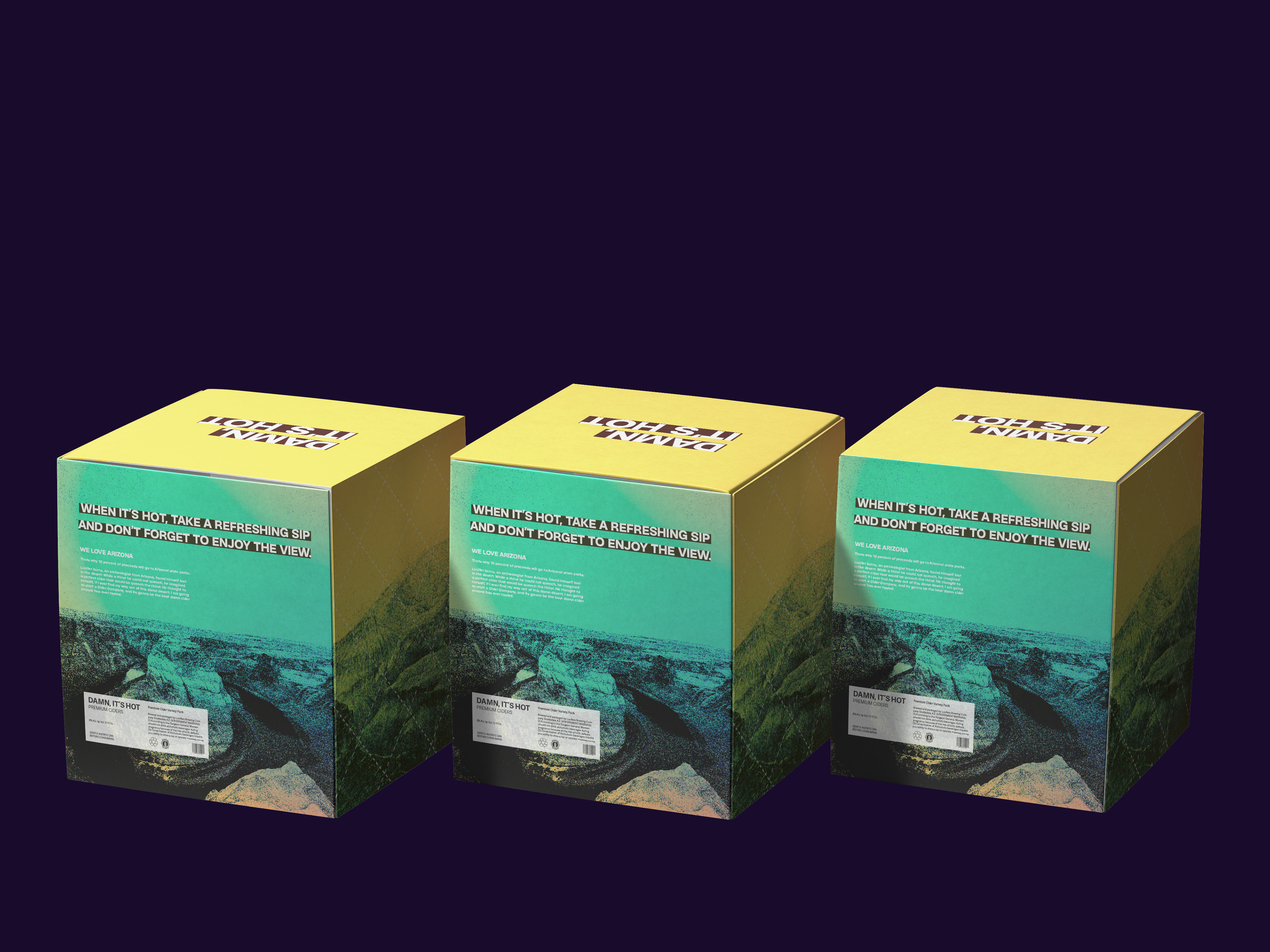 Packaging for an Arizona based cider company, focusing on heat map overlays, warm colors, and imagery of popular Arizona landmarks.